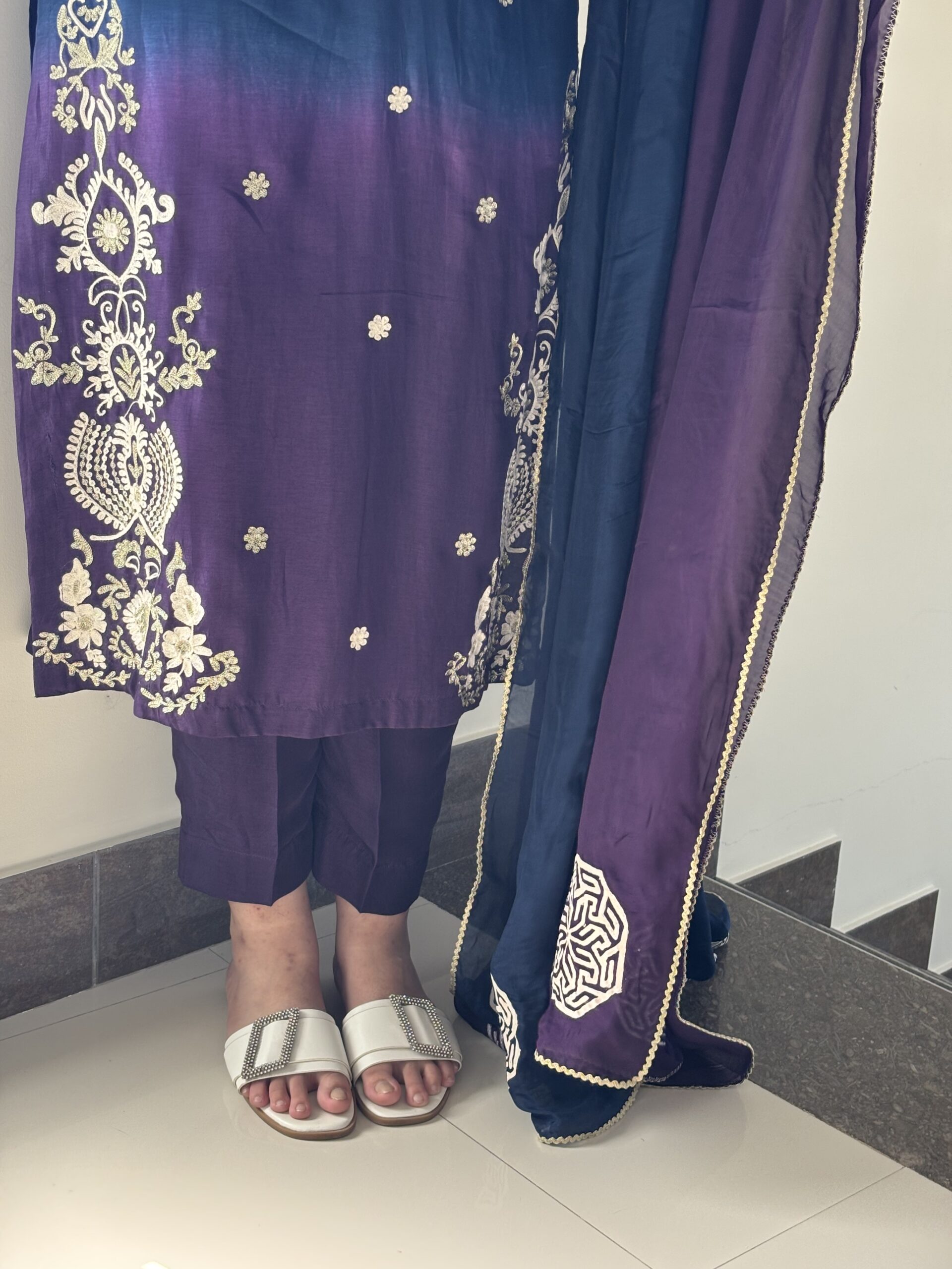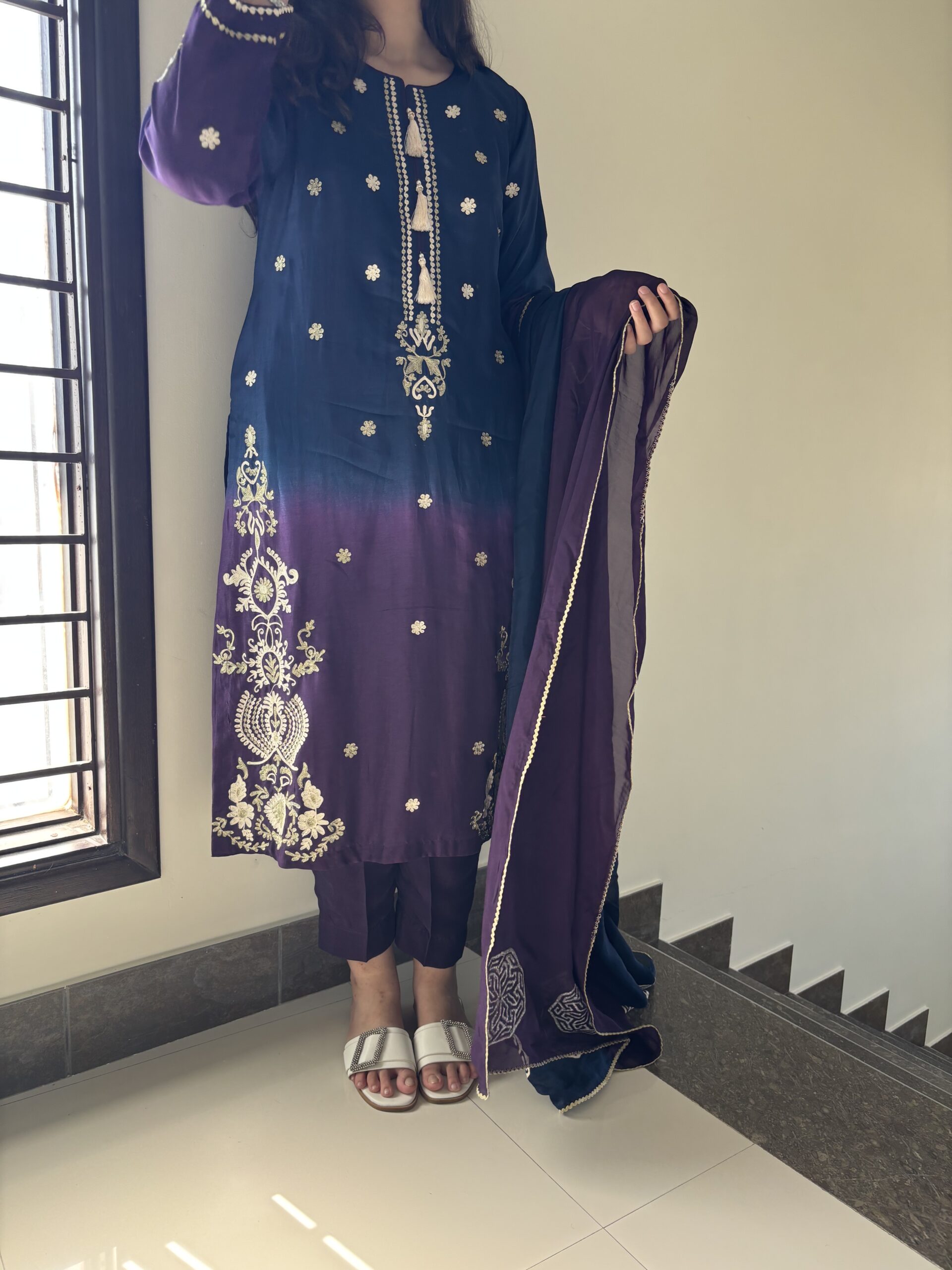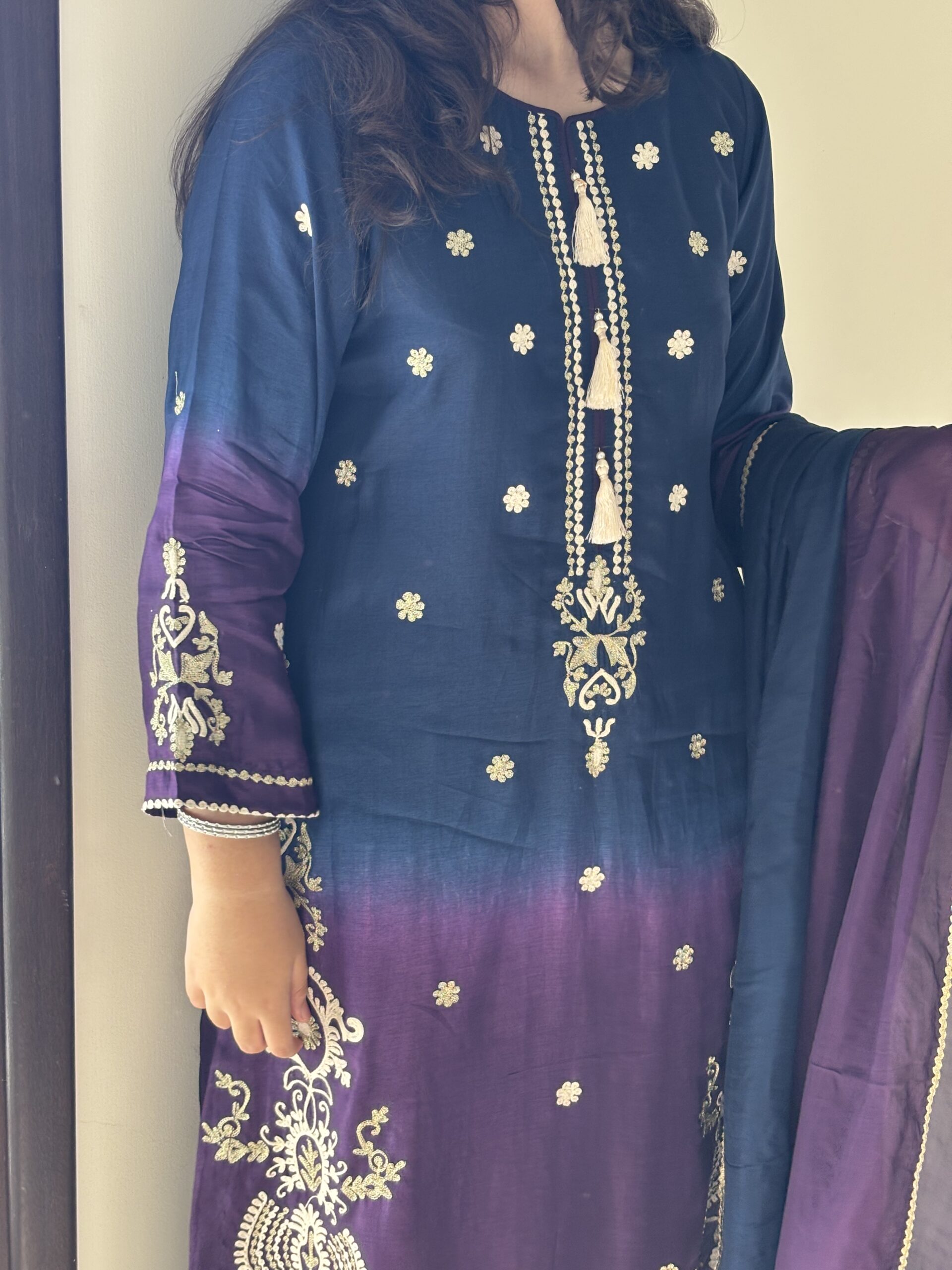 Pure shaded tussle silk long shirt with beautiful thread and Resham work styled with medium silk long dupatta this ensemble is designed perfectly for Eid 2026 for the modern look who cherishes tradition.