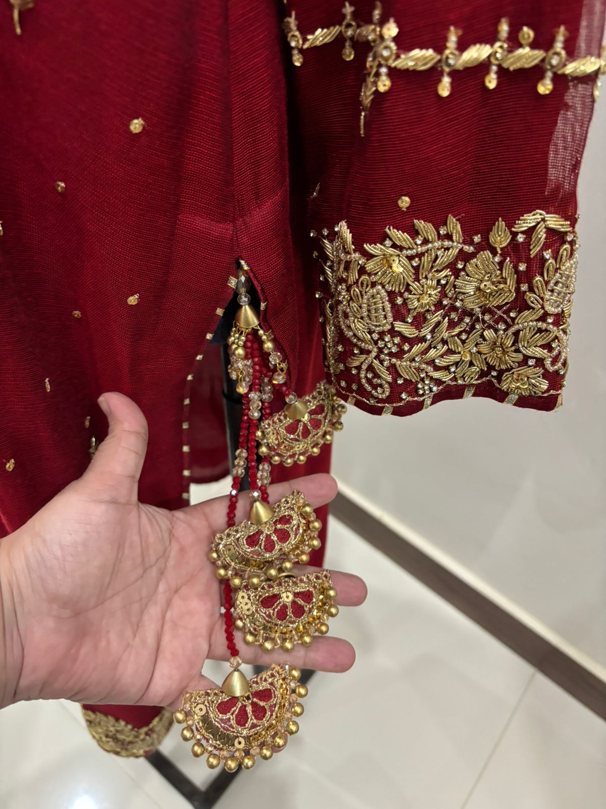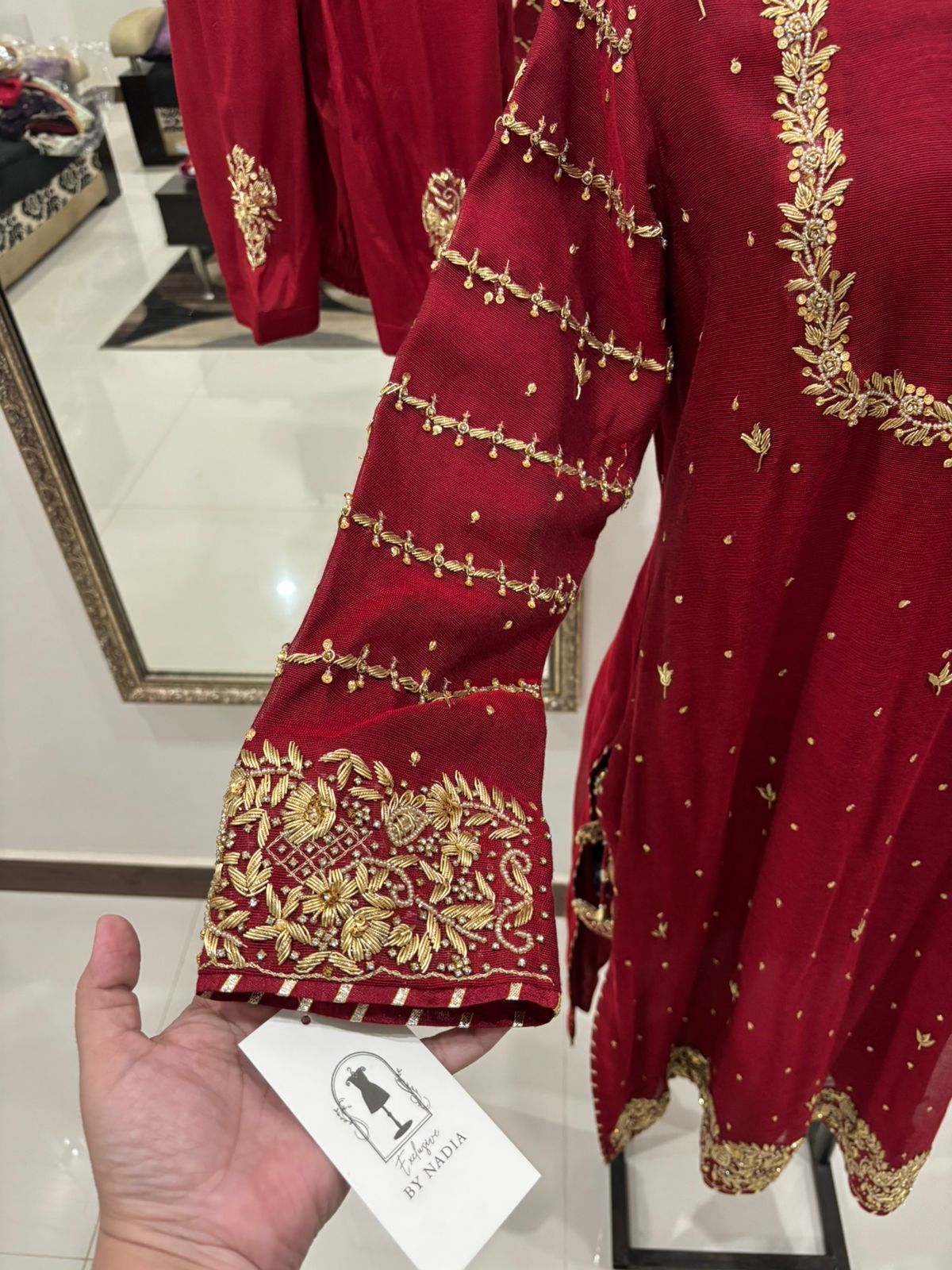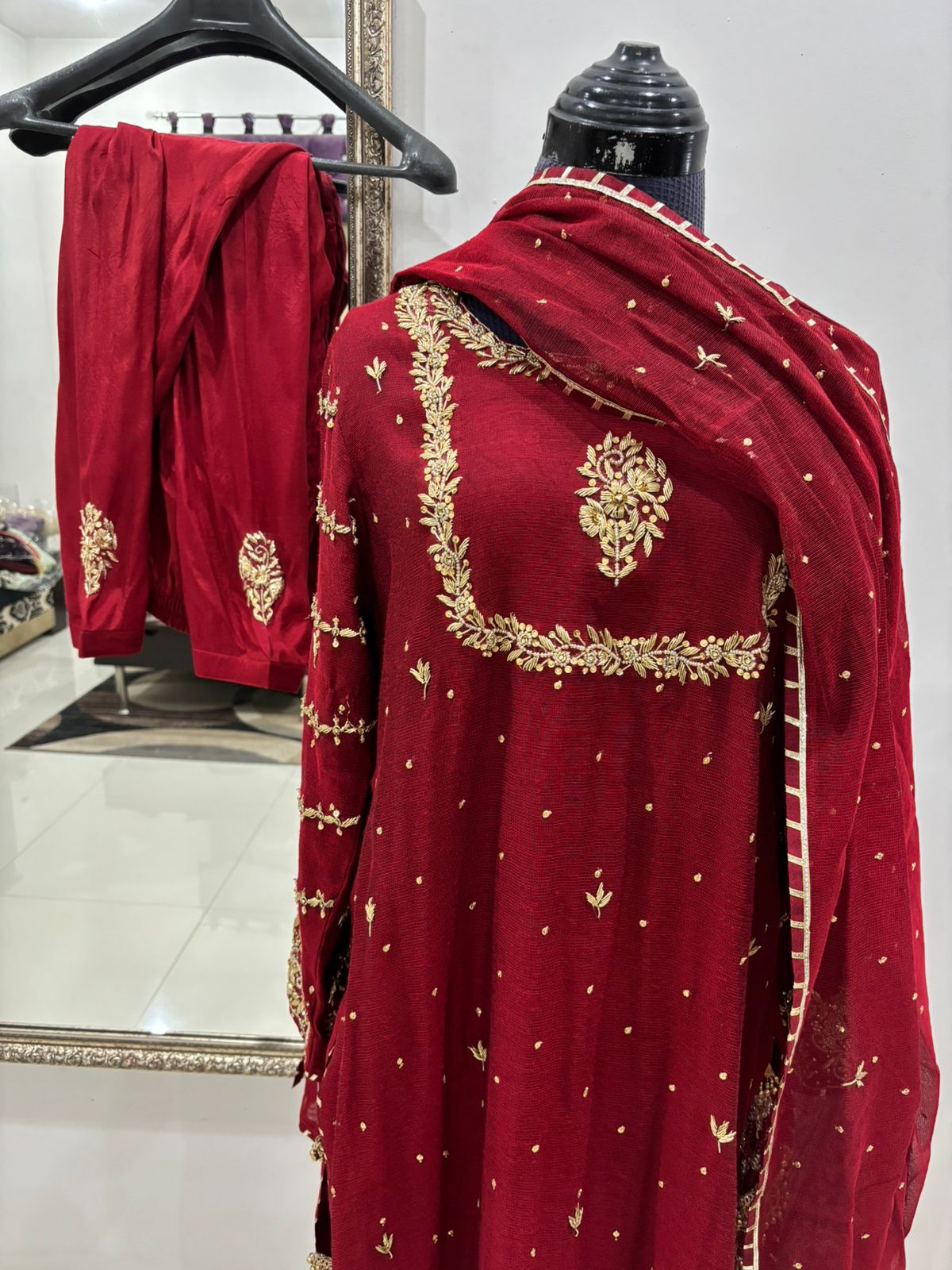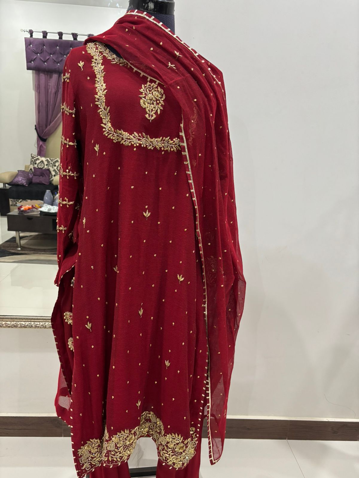 A captivating red khadi net outfit with subtle gold zardozi work on the shirt, paired with silk pants featuring delicate motive embroidery that harmonizes with the shirt’s design. The shirt is enhanced with heavily worked sleeves for a regal touch.
